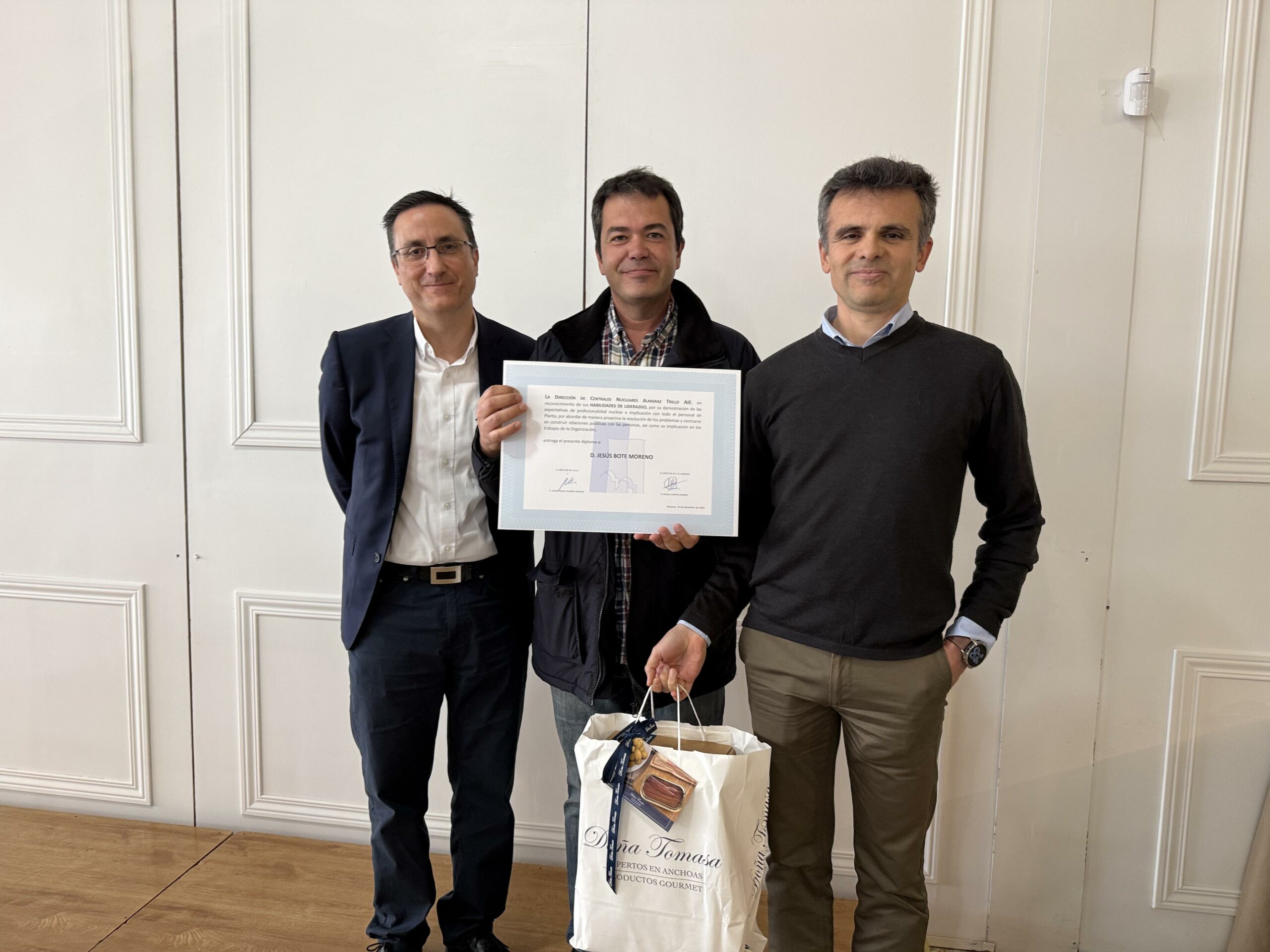 El reconocimiento al liderazgo se concedió a Joaquín Galán Alcón, Carlos Muñoz Corral y Juan José Pérez Gil, técnicos Expertos de Protección Radiológica de CNAT. El premio destaca el liderazgo mostrado durante las actividades de la recarga, especialmente en el taller mecánico frío, tras su reclasificación como zona controlada.